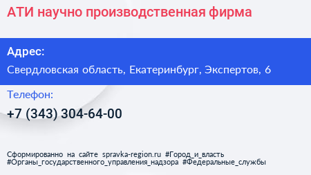 АТИ, научно-производственная фирма по адресу Свердловская область, Екатеринбург, Экспертов, 6 в дальнейшем Организация, размещена в следующих категориях: