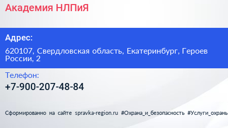 Академия НЛПиЯ по адресу 620107, Свердловская область, Екатеринбург, Героев России, 2 в дальнейшем Организация, размещена в следующих категориях: