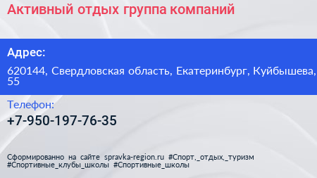 Активный отдых, группа компаний по адресу 620144, Свердловская область, Екатеринбург, Куйбышева, 55 в дальнейшем Организация, размещена в следующих категориях: