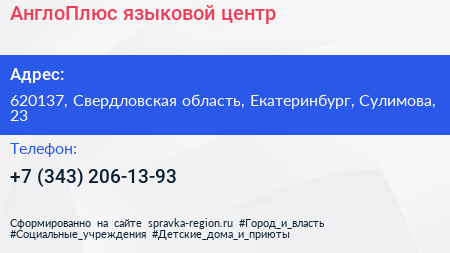 АнглоПлюс, языковой центр по адресу 620137, Свердловская область, Екатеринбург, Сулимова, 23 в дальнейшем Организация, размещена в следующих категориях: