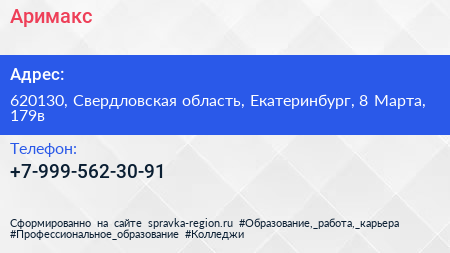 Аримакс по адресу 620130, Свердловская область, Екатеринбург, 8 Марта, 179в в дальнейшем Организация, размещена в следующих категориях: