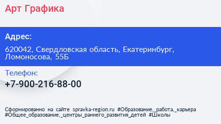 Арт-Графика по адресу 620042, Свердловская область, Екатеринбург, Ломоносова, 55Б в дальнейшем Организация, размещена в следующих категориях: