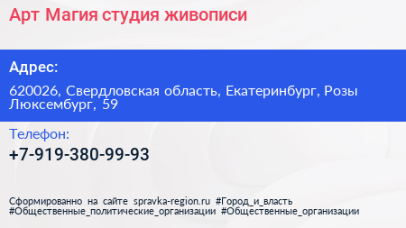 Арт Магия, студия живописи по адресу 620026, Свердловская область, Екатеринбург, Розы Люксембург, 59 в дальнейшем Организация, размещена в следующих категориях: