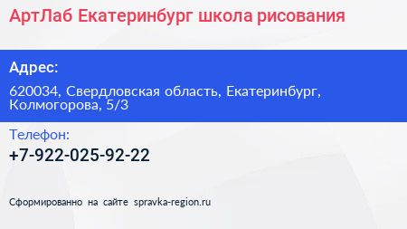 АртЛаб Екатеринбург, школа рисования по адресу 620034, Свердловская область, Екатеринбург, Колмогорова, 5/3 в дальнейшем Организация, размещена в следующих категориях: