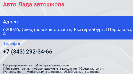 Авто-Лада, автошкола по адресу 620076, Свердловская область, Екатеринбург, Щербакова, 4 в дальнейшем Организация, размещена в следующих категориях: