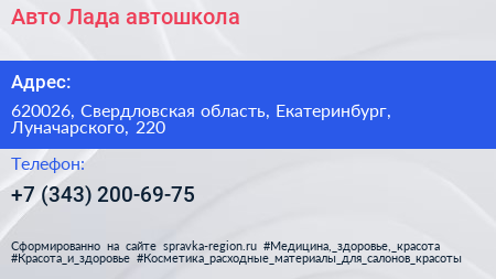 Авто-Лада, автошкола по адресу 620026, Свердловская область, Екатеринбург, Луначарского, 220 в дальнейшем Организация, размещена в следующих категориях: