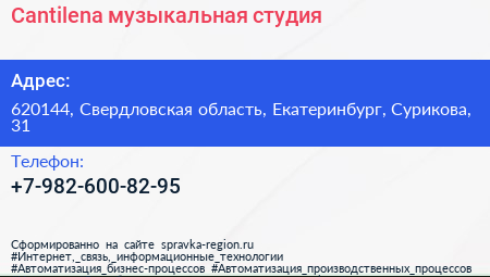 Cantilena, музыкальная студия по адресу 620144, Свердловская область, Екатеринбург, Сурикова, 31 в дальнейшем Организация, размещена в следующих категориях: