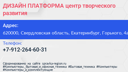 ДИЗАЙН-ПЛАТФОРМА, центр творческого развития по адресу 620000, Свердловская область, Екатеринбург, Горького, 4а в дальнейшем Организация, размещена в следующих категориях: