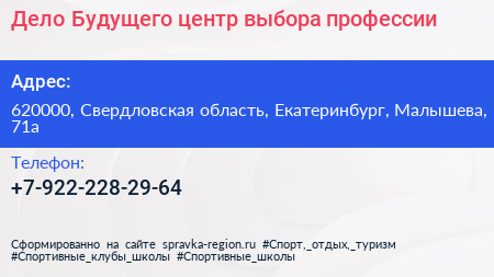 Дело Будущего, центр выбора профессии по адресу 620000, Свердловская область, Екатеринбург, Малышева, 71а в дальнейшем Организация, размещена в следующих категориях:
