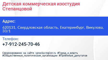 Детская коммерческая изостудия Степанцовой по адресу 620131, Свердловская область, Екатеринбург, Викулова, 33/1 в дальнейшем Организация, размещена в следующих категориях: