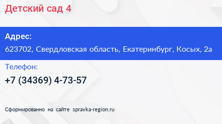 Детский сад №4 по адресу 623702, Свердловская область, Екатеринбург, Косых, 2а в дальнейшем Организация, размещена в следующих категориях:
