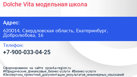 Dolche Vita, модельная школа по адресу 620014, Свердловская область, Екатеринбург, Добролюбова, 16 в дальнейшем Организация, размещена в следующих категориях: