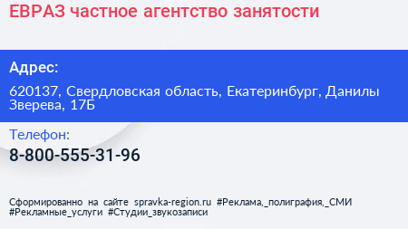 ЕВРАЗ, частное агентство занятости по адресу 620137, Свердловская область, Екатеринбург, Данилы Зверева, 17Б в дальнейшем Организация, размещена в следующих категориях: