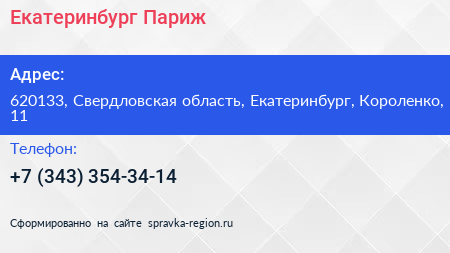 Екатеринбург-Париж по адресу 620133, Свердловская область, Екатеринбург, Короленко, 11 в дальнейшем Организация, размещена в следующих категориях: