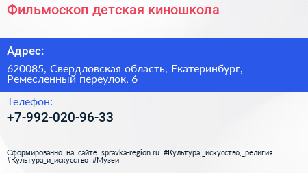Фильмоскоп, детская киношкола по адресу 620085, Свердловская область, Екатеринбург, Ремесленный переулок, 6 в дальнейшем Организация, размещена в следующих категориях: