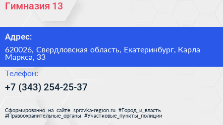 Гимназия №13 по адресу 620026, Свердловская область, Екатеринбург, Карла Маркса, 33 в дальнейшем Организация, размещена в следующих категориях: