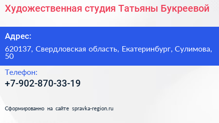 Художественная студия Татьяны Букреевой по адресу 620137, Свердловская область, Екатеринбург, Сулимова, 50 в дальнейшем Организация, размещена в следующих категориях:
