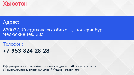 Хьюстон по адресу 620027, Свердловская область, Екатеринбург, Челюскинцев, 33а в дальнейшем Организация, размещена в следующих категориях:
