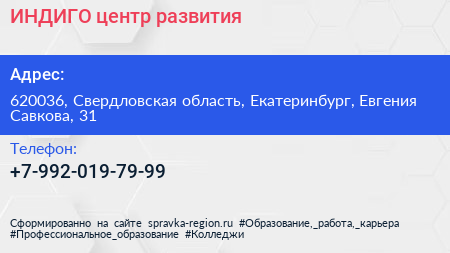 ИНДИГО, центр развития по адресу 620036, Свердловская область, Екатеринбург, Евгения Савкова, 31 в дальнейшем Организация, размещена в следующих категориях:
