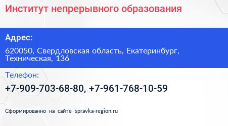 Институт непрерывного образования по адресу 620050, Свердловская область, Екатеринбург, Техническая, 136 в дальнейшем Организация, размещена в следующих категориях: