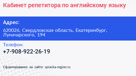 Кабинет репетитора по английскому языку по адресу 620026, Свердловская область, Екатеринбург, Луначарского, 194 в дальнейшем Организация, размещена в следующих категориях: