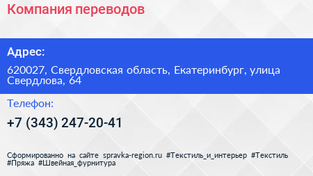Компания переводов по адресу 620027, Свердловская область, Екатеринбург, улица Свердлова, 64 в дальнейшем Организация, размещена в следующих категориях: