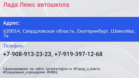 Лада-Люкс, автошкола по адресу 620014, Свердловская область, Екатеринбург, Шевелёва, 7а в дальнейшем Организация, размещена в следующих категориях: