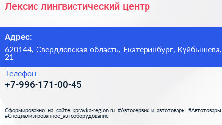 Лексис, лингвистический центр по адресу 620144, Свердловская область, Екатеринбург, Куйбышева, 21 в дальнейшем Организация, размещена в следующих категориях: