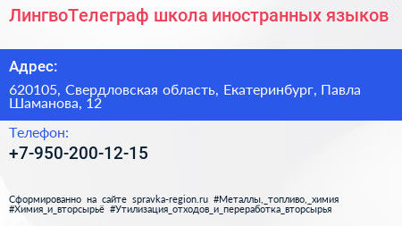 ЛингвоТелеграф, школа иностранных языков по адресу 620105, Свердловская область, Екатеринбург, Павла Шаманова, 12 в дальнейшем Организация, размещена в следующих категориях: