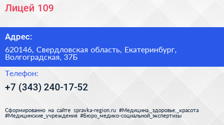 Лицей №109 по адресу 620146, Свердловская область, Екатеринбург, Волгоградская, 37Б в дальнейшем Организация, размещена в следующих категориях: