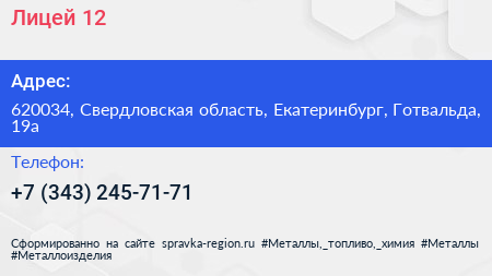 Лицей №12 по адресу 620034, Свердловская область, Екатеринбург, Готвальда, 19а в дальнейшем Организация, размещена в следующих категориях: