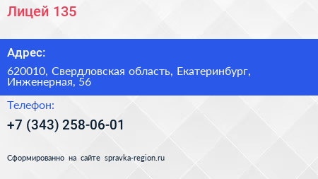Лицей №135 по адресу 620010, Свердловская область, Екатеринбург, Инженерная, 56 в дальнейшем Организация, размещена в следующих категориях: