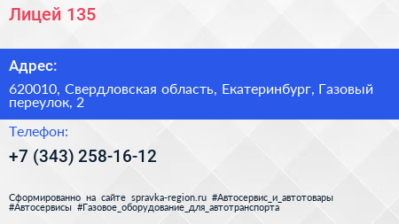 Лицей №135 по адресу 620010, Свердловская область, Екатеринбург, Газовый переулок, 2 в дальнейшем Организация, размещена в следующих категориях: