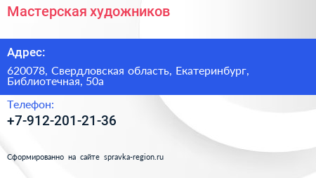 Мастерская художников по адресу 620078, Свердловская область, Екатеринбург, Библиотечная, 50а в дальнейшем Организация, размещена в следующих категориях: