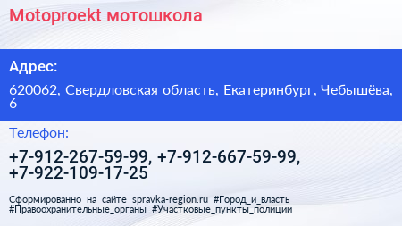 Motoproekt, мотошкола по адресу 620062, Свердловская область, Екатеринбург, Чебышёва, 6 в дальнейшем Организация, размещена в следующих категориях: