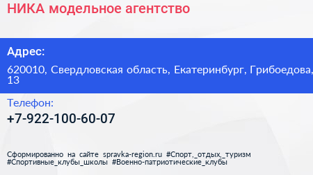 НИКА, модельное агентство по адресу 620010, Свердловская область, Екатеринбург, Грибоедова, 13 в дальнейшем Организация, размещена в следующих категориях: