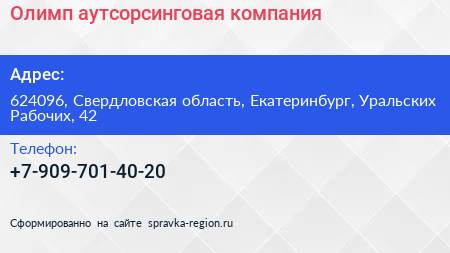 Олимп, аутсорсинговая компания по адресу 624096, Свердловская область, Екатеринбург, Уральских Рабочих, 42 в дальнейшем Организация, размещена в следующих категориях:
