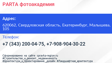 PARTA, фотоакадемия по адресу 620062, Свердловская область, Екатеринбург, Малышева, 105 в дальнейшем Организация, размещена в следующих категориях:
