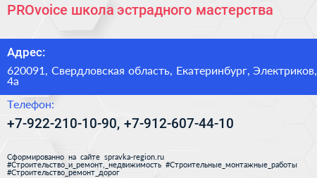 PROvoice, школа эстрадного мастерства по адресу 620091, Свердловская область, Екатеринбург, Электриков, 4а в дальнейшем Организация, размещена в следующих категориях: