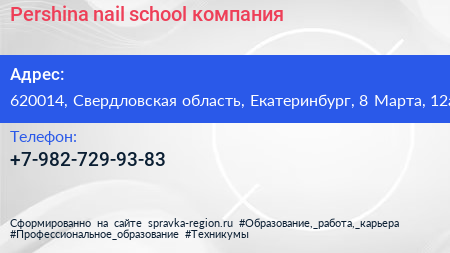 Pershina nail school, компания по адресу 620014, Свердловская область, Екатеринбург, 8 Марта, 12а в дальнейшем Организация, размещена в следующих категориях: