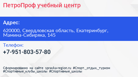 ПетроПроф, учебный центр по адресу 620000, Свердловская область, Екатеринбург, Мамина-Сибиряка, 145 в дальнейшем Организация, размещена в следующих категориях: