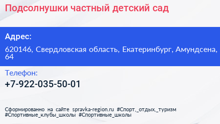 Подсолнушки, частный детский сад по адресу 620146, Свердловская область, Екатеринбург, Амундсена, 64 в дальнейшем Организация, размещена в следующих категориях: