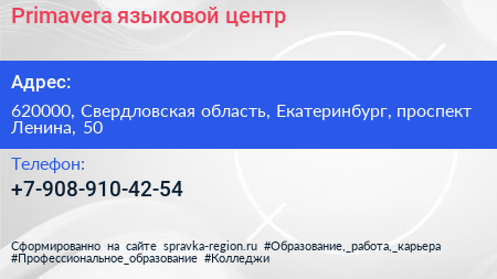 Primavera, языковой центр по адресу 620000, Свердловская область, Екатеринбург, проспект Ленина, 50 в дальнейшем Организация, размещена в следующих категориях: