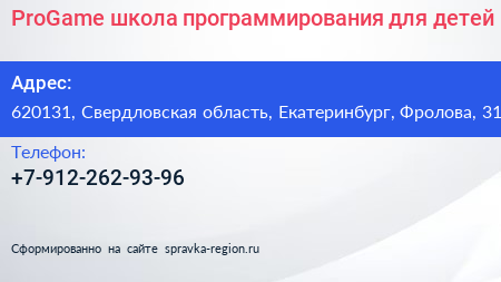 ProGame, школа программирования для детей по адресу 620131, Свердловская область, Екатеринбург, Фролова, 31 в дальнейшем Организация, размещена в следующих категориях: