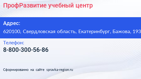 ПрофРазвитие, учебный центр по адресу 620100, Свердловская область, Екатеринбург, Бажова, 193 в дальнейшем Организация, размещена в следующих категориях: