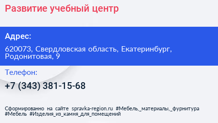 Развитие, учебный центр по адресу 620073, Свердловская область, Екатеринбург, Родонитовая, 9 в дальнейшем Организация, размещена в следующих категориях: