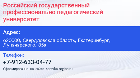Российский государственный профессионально-педагогический университет по адресу 620000, Свердловская область, Екатеринбург, Луначарского, 85а в дальнейшем Организация, размещена в следующих категориях: