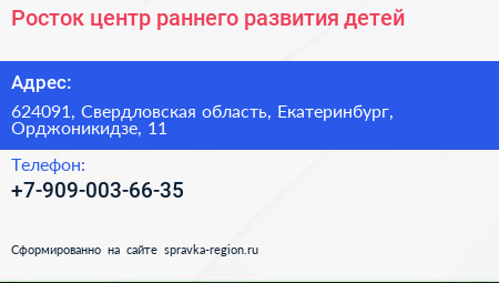 Росток, центр раннего развития детей по адресу 624091, Свердловская область, Екатеринбург, Орджоникидзе, 11 в дальнейшем Организация, размещена в следующих категориях: