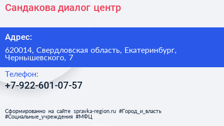 Сандакова, диалог-центр по адресу 620014, Свердловская область, Екатеринбург, Чернышевского, 7 в дальнейшем Организация, размещена в следующих категориях: