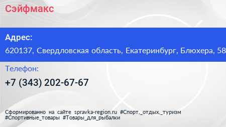 Сэйфмакс по адресу 620137, Свердловская область, Екатеринбург, Блюхера, 58 в дальнейшем Организация, размещена в следующих категориях: